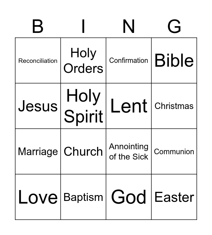 This bingo card has 16 words: Baptism, Communion, Confirmation, Reconciliation, Marriage, Holy Orders, Annointing of the Sick, God, Jesus, Holy Spirit, Love, Bible, Church, Christmas, Lent and Easter.