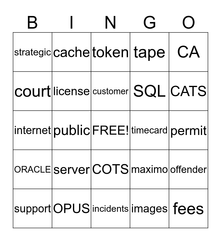 This bingo card has a free space and 24 words: server, OPUS, customer, support, CA, strategic, court, cache, timecard, COTS, SQL, internet, maximo, offender, license, images, permit, token, CATS, public, fees, ORACLE, tape and incidents.