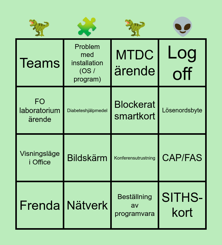 This bingo card has 33 words: Cosmic support/användarstöd, Diktering/TIK, CAP/FAS, Dockningsstation, SITHS-kort, Blockerat smartkort, FO laboratorium ärende, Felringning/ Hänvisning, Problem med installation (OS / program), Ljudinställningar, Lösenordsbyte, MTDC ärende, Cosmic Mediahanterare, Problem i Microsoft Office-program, Nätverk, Bildskärm, Skrivare, Konferensutrustning, Skype/Zoom, Statusförfrågan, VPN/domän, G: / H: saknas, Teams, Beställning av programvara, Mobil enhet, Frenda, Log off, Visningsläge i Office, Diabeteshjälpmedel, Kan inte starta Edge, Siths ominstallation, Microsoft authenticator and Reset citrix Workspace.
