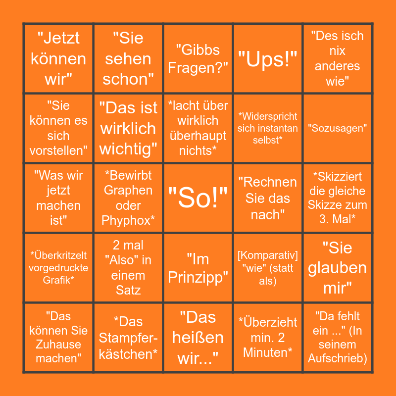This bingo card has a free space and 24 words: 2 mal "Also" in einem Satz, *Das Stampfer-kästchen*, *lacht über wirklich überhaupt nichts*, "Das können Sie Zuhause machen", "Des isch nix anderes wie", "Jetzt können wir", "Sie können es sich vorstellen", "Sie sehen schon", "Rechnen Sie das nach", "Im Prinzipp", *Widerspricht sich instantan selbst*, "Was wir jetzt machen ist", [Komparativ] "wie" (statt als), "Sie glauben mir", "Das ist wirklich wichtig", *Überzieht min. 2 Minuten*, *Skizziert die gleiche Skizze zum 3. Mal*, "Gibbs Fragen?", "Sozusagen", *Bewirbt Graphen oder Phyphox*, "Da fehlt ein ..." (In seinem Aufschrieb), *Überkritzelt vorgedruckte Grafik*, "Ups!" and "Das heißen wir...".