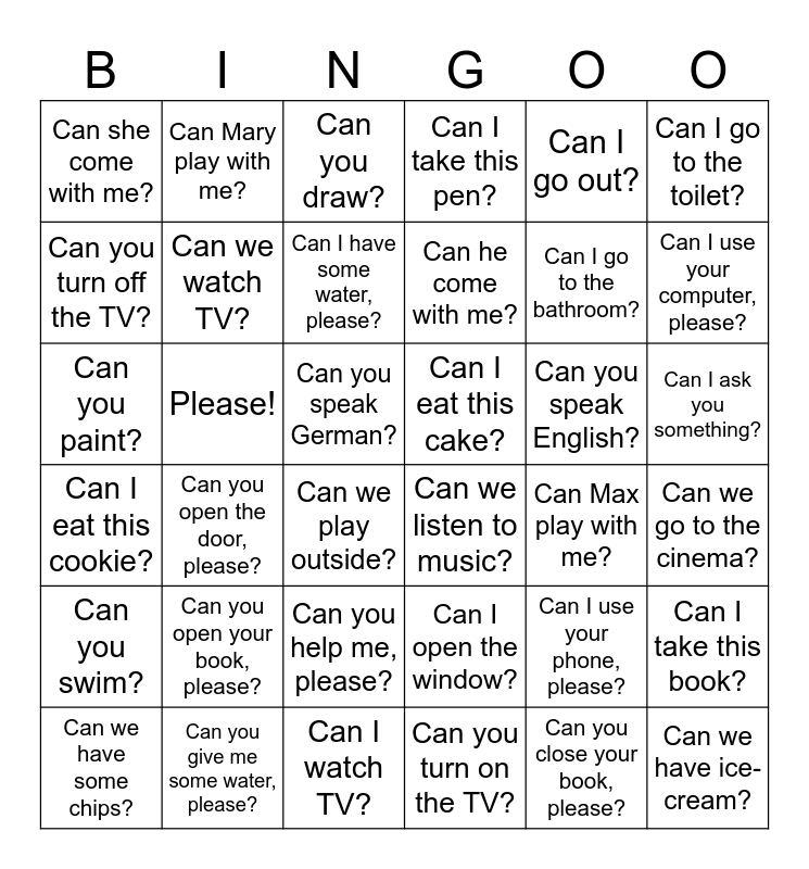 This bingo card has 36 words: Can I open the window?, Can you help me, please?, Can you turn on the TV?, Can you turn off the TV?, Can I eat this cookie?, Can I eat this cake?, Can we watch TV?, Can I watch TV?, Can I go out?, Can I use your phone, please?, Can I use your computer, please?, Can I take this pen?, Can I take this book?, Please!, Can he come with me?, Can she come with me?, Can you swim?, Can you speak English?, Can you paint?, Can you draw?, Can you speak German?, Can you open the door, please?, Can we listen to music?, Can we play outside?, Can Max play with me?, Can Mary play with me?, Can I go to the bathroom?, Can you give me some water, please?, Can I have some water, please?, Can I go to the toilet?, Can we have ice-cream?, Can we have some chips?, Can we go to the cinema?, Can I ask you something?, Can you open your book, please? and Can you close your book, please?.