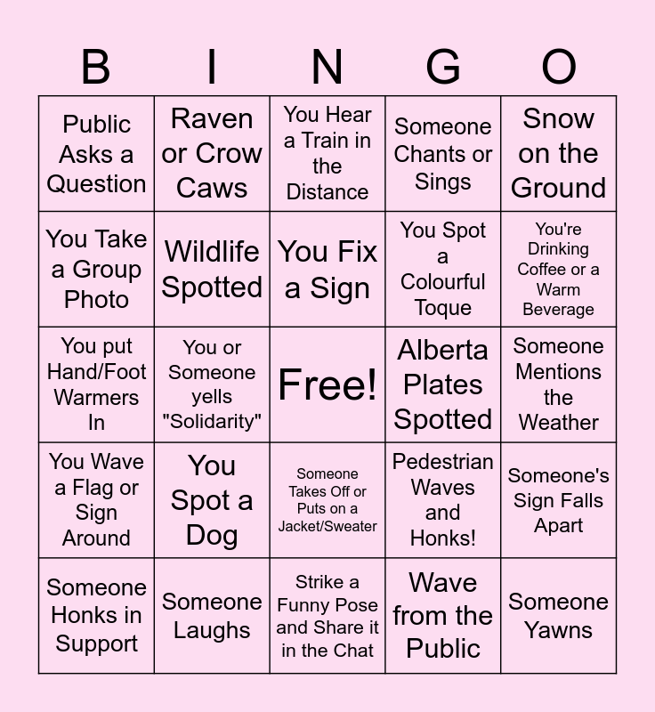 This bingo card has a free space and 24 words: Someone Honks in Support, You Spot a Dog, You Fix a Sign, Wave from the Public, Snow on the Ground, Public Asks a Question, Raven or Crow Caws, You Hear a Train in the Distance, Alberta Plates Spotted, Someone Mentions the Weather, You put Hand/Foot Warmers In, Wildlife Spotted, Pedestrian Waves and Honks!, Someone's Sign Falls Apart, You Take a Group Photo, Someone Laughs, Strike a Funny Pose and Share it in the Chat, Someone Chants or Sings, You're Drinking Coffee or a Warm Beverage, You Wave a Flag or Sign Around, You or Someone yells "Solidarity", Someone Takes Off or Puts on a Jacket/Sweater, You Spot a Colourful Toque and Someone Yawns.