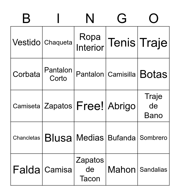 This bingo card has a free space and 24 words: Blusa, Camisa, Pantalon, Falda, Traje, Vestido, Corbata, Chaqueta, Abrigo, Medias, Camisilla, Camiseta, Bufanda, Sombrero, Pantalon Corto, Mahon, Traje de Bano, Ropa Interior, Botas, Zapatos, Sandalias, Chancletas, Tenis and Zapatos de Tacon.