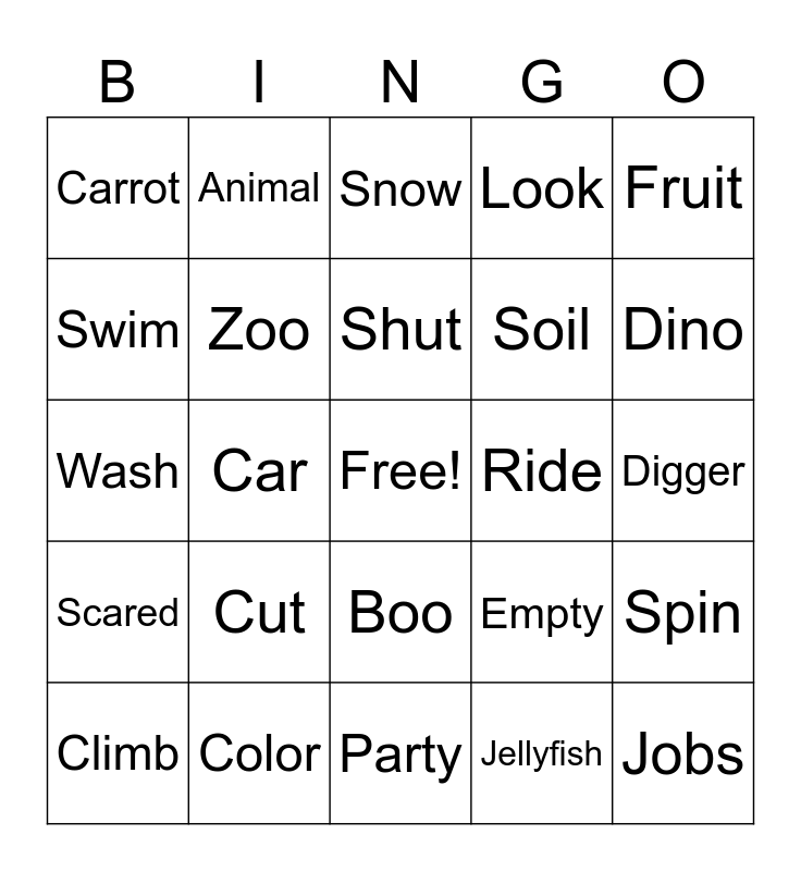 This bingo card has a free space and 101 words: Dark, School, Fruit, Bus, Pets, Write, Elephant, Finger, Roar, Belt, Hop, Shaker, Iguana, Play, Slide, Towel, Scared, Car, Race, Ear, Push, Paint, Skip, Build, Roll, Dino, Look, Cut, Cook, Hang, Animal, Snow, Block, Bike, Crying, Boo, Hurt, Doctor, Jellyfish, Party, Down, Climb, Feeling, Finish, Tug, Jobs, Sick, Worried, Kick, Fire, Bake, Swim, Read, Scoop, Splash, Silly, Train, Give, King, Plant, Zoo, Lick, Brave, Chick, Sleep, Soil, Face, Car, Color, Karate, Balloon, House, Carrot, Drive, Shut, Wash, Baby, Teddy, Walk, Trip, Shark, Cream, Ride, Snorkel, Knee, Shape, Digger, Bath, Show, Police, Empty, Cowboy, Monkey, Teeth, Recycle, Spin, Playground, Monster, Ballet, Hit and Spy.