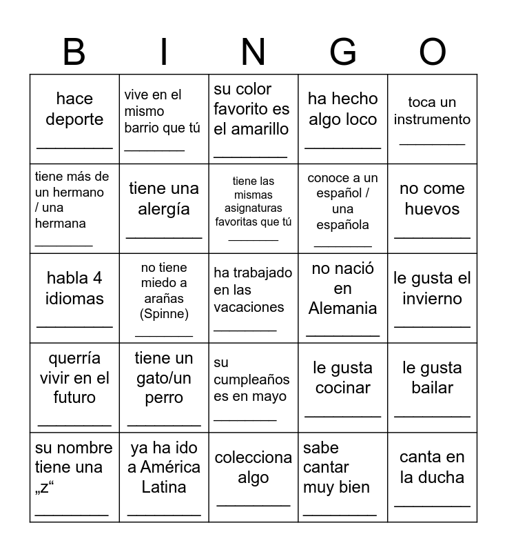 This bingo card has a free space and 24 words: tiene un gato/un perro ________, ya ha ido a América Latina ________, tiene las mismas asignaturas favoritas que tú ________, su nombre tiene una „z“ ________, toca un instrumento ________, hace deporte ________, tiene más de un hermano / una hermana ________, vive en el mismo barrio que tú ________, no nació en Alemania ________, su cumpleaños es en mayo ________, conoce a un español / una española ________, habla 4 idiomas ________, le gusta cocinar ________, le gusta bailar ________, tiene una alergía ________, sabe cantar muy bien ________, le gusta el invierno ________, su color favorito es el amarillo ________, no come huevos ________, no tiene miedo a arañas (Spinne) ________, canta en la ducha ________, querría vivir en el futuro ________, ha hecho algo loco ________ and colecciona algo ________.