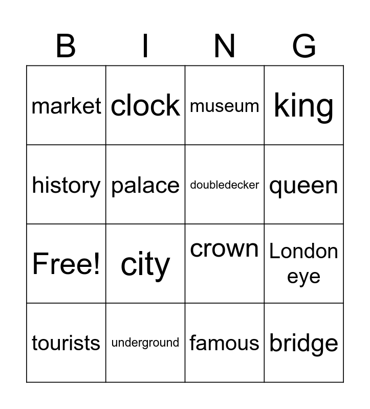 This bingo card has 20 words: London eye, Big Ben, museum, skyline, tourists, history, underground, market, Free!, clock, city, crown, palace, bridge, doubledecker, thames, queen, king, famous and housebar.