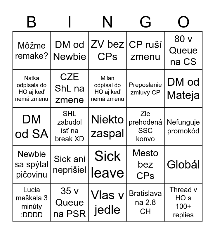 This bingo card has 45 words: Navrhnutý break počas niekoho breaku, Niekto zaspal, Newbie zaspal, Lucia meškala 3 minúty :DDDD, Niekto meškal viac ako 3 minúty, Bratislava na 2.8 CH, ZV bez CPs, LM na 6.5 CH, 80 v Queue na CS, 35 v Queue na PSR, CP ruší zmenu, Zle prehodená SSC konvo, Sick leave, Sick ani neprišiel, CP mal nehodu, Vlas v jedle, Aký má CP contract?, DM od SA, DM od Marjen, DM od Mateja, DM od Newbie, Ako mám spraviť redelivery?, Ako mám prehodiť cash?, Môžme remake?, Je to fraud?, Nefunguje promokód, Je to na zápis?, CP ES, Mesto bez CPs, Newbie sa spýtal pičovinu, Otázka na pinned thread, Globál, HO down, Wolt market nesúhlasí s deductom, SA zabudol ísť na break, SHL zabudol ísť na break XD, Thread v HO s 50+ replies, Thread v HO s 75+ replies, Thread v HO s 100+ replies, Milan odpísal do HO aj keď nemá zmenu, Natka odpísala do HO aj keď nemá zmenu, Preposlanie zmluvy CP, Môžem mať break neskôr?, CZE ShL na zmene and Mám nastavený AC?.