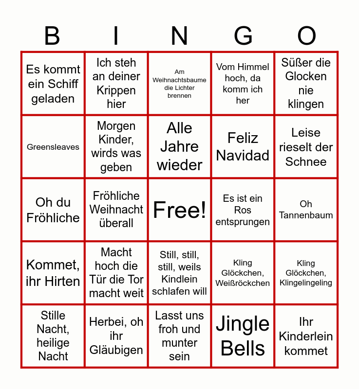 This bingo card has a free space and 28 words: Kling Glöckchen, Klingelingeling, We Wish You a Merry Christmas, Feliz Navidad, Jingle Bells, Greensleaves, Am Weihnachtsbaume die Lichter brennen, Ich steh an deiner Krippen hier, Kommet, ihr Hirten, Es ist ein Ros entsprungen, Stille Nacht, heilige Nacht, Oh du Fröhliche, Vom Himmel hoch, da komm ich her, Herbei, oh ihr Gläubigen, Lasst uns froh und munter sein, Leise rieselt der Schnee, In der Weihnachtsbäckerei, Macht hoch die Tür die Tor macht weit, Morgen Kinder, wirds was geben, Alle Jahre wieder, Still, still, still, weils Kindlein schlafen will, Es kommt ein Schiff geladen, Morgen kommt der Weihnachtsmann, Ihr Kinderlein kommet, Fröhliche Weihnacht überall, Oh Tannenbaum, Kling Glöckchen, Weißröckchen, Süßer die Glocken nie klingen and Tochter Zion.