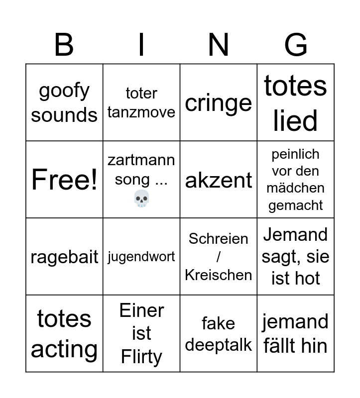 This bingo card has 16 words: Einer ist Flirty, Jemand sagt, sie ist hot, cringe, goofy sounds, ragebait, toter tanzmove, Schreien / Kreischen, fake deeptalk, Free!, zartmann song ... 💀, totes acting, totes lied, jugendwort, peinlich vor den mädchen gemacht, akzent and jemand fällt hin.