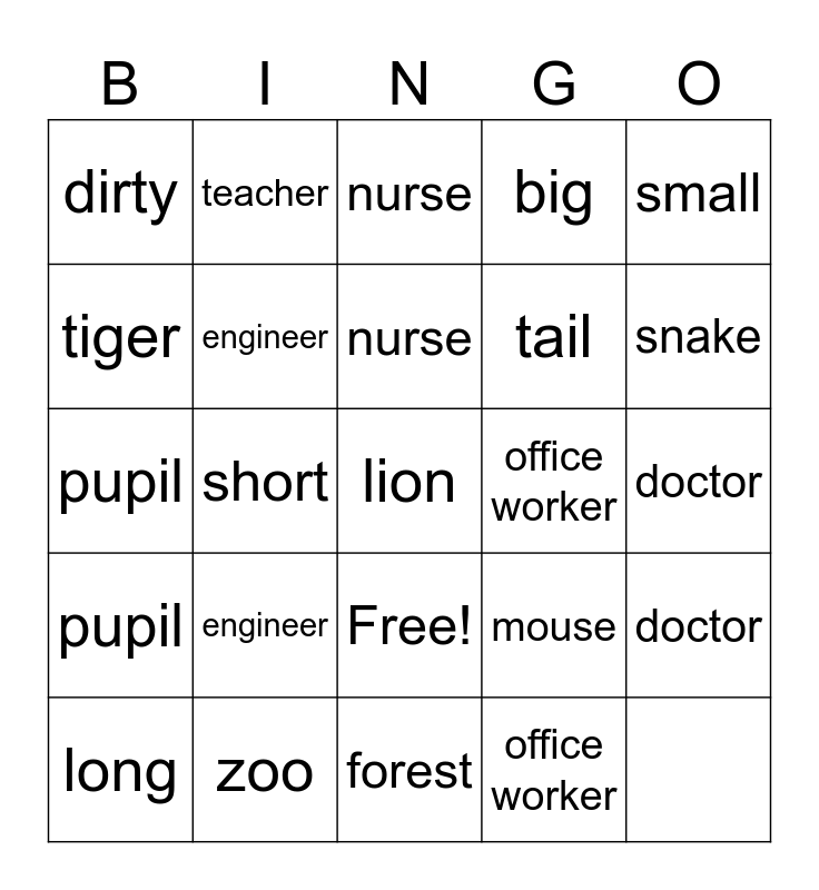 This bingo card has 25 words: Free!, long, short, clean, big, small, dirty, teacher, lion, mouse, snake, tiger, zoo, forest, tail, doctor, pupil, engineer, nurse, office worker, doctor, pupil, engineer, nurse and office worker.