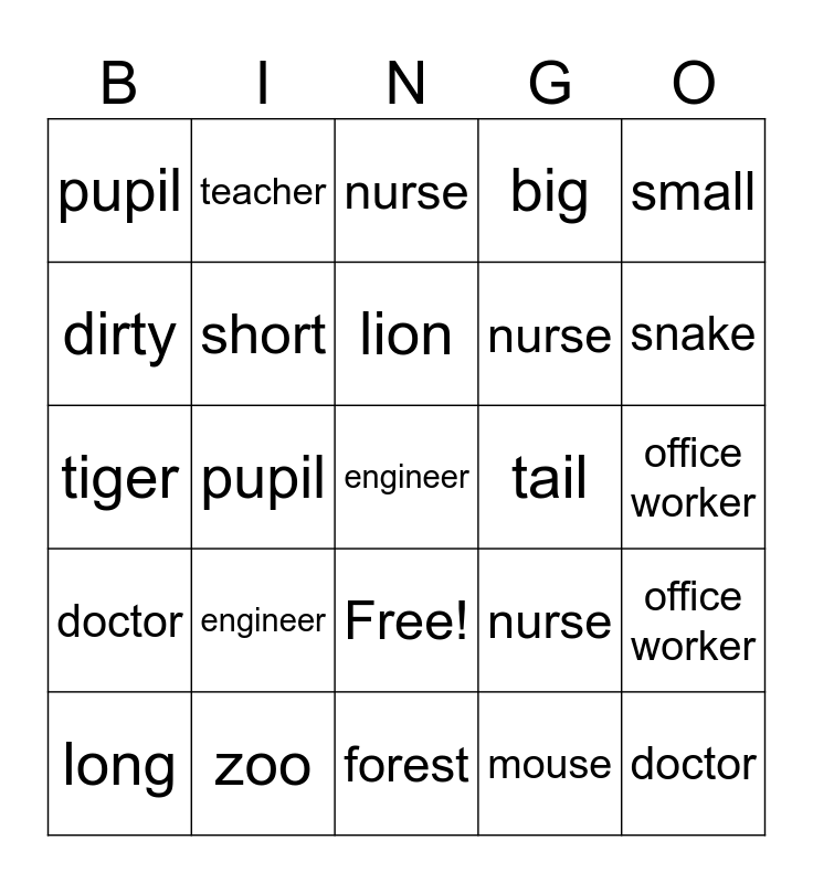 This bingo card has 26 words: Free!, long, short, clean, big, small, dirty, teacher, lion, mouse, snake, tiger, zoo, forest, tail, doctor, pupil, engineer, nurse, nurse, office worker, doctor, pupil, engineer, nurse and office worker.