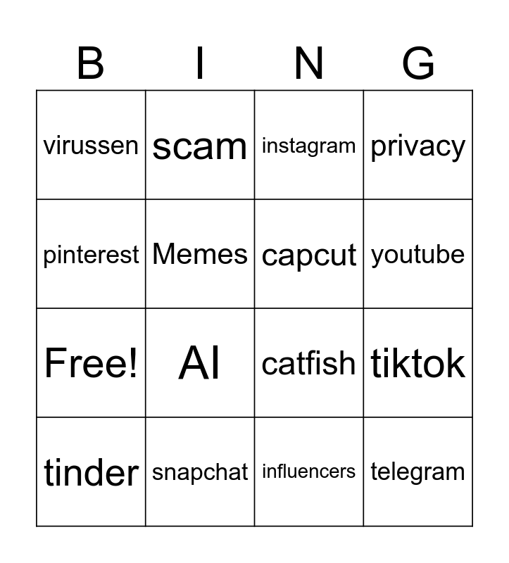 This bingo card has 20 words: tiktok, facebook, instagram, whatsapp, tinder, pinterest, snapchat, virussen, Free!, scam, AI, catfish, Memes, telegram, capcut, X, youtube, privacy, influencers and reclame.