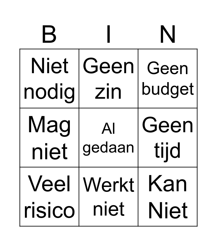 This bingo card has a free space and 8 words: Geen tijd, Geen budget, Geen zin, Veel risico, Niet nodig, Kan Niet, Mag niet and Werkt niet.