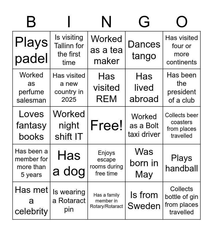 This bingo card has a free space and 61 words: Collects cufflinks, Is wearing a Rotaract pin, Used to be an official notetaker in school, Has been a member for more than 5 years, Is from Sweden, Has been the vice president of a club, Has visited a new country in 2025, Can do 20 push-ups, Has lived abroad, Collects Coca-Cola cans/bottles, Dances tango, Collects elephant figures, Worked as perfume salesman, Speaks three or more languages, Has visited Tallinn before, Plays padel, Collects bottle of gin from places travelled, Has visited four or more continents, Has visited post-REM, Has visited REM, Worked as a Bolt taxi driver, Worked as a tea maker, Has met a celebrity, Plays handball, Collects magnets, Has been a video game tester, Loves pineapple on pizza, Is from Italy, Has been the president of a club, Celebrated a birthday recently, Has been a member for more than 4 years, Collects CDs, Plays darts, Collects shot glasses, Is visiting Tallinn for the first time, Has participated in a clean-up day, Has been skydiving, Worked night shift IT, Collects Minion cups, Loves fantasy books, Collects pins, Has a dog, Collects beer coasters from places travelled, Has been the treasurer of a club, Was born in May, Collects business cards, Is from Estonia, Collects keyrings, Reads Tarot cards, Enjoys escape rooms during free time, Has a family member in Rotary/Rotaract, Has taken a cruise, Is vegetarian, Collects postcards from places travelled, Loves rollercoasters, Collects minis, Has attended a Rotaract meeting outside their club, Has taken a selfie tonight, Is from Germany, Arrived to Tallinn on Thursday and Has been a member for more than 3 years.