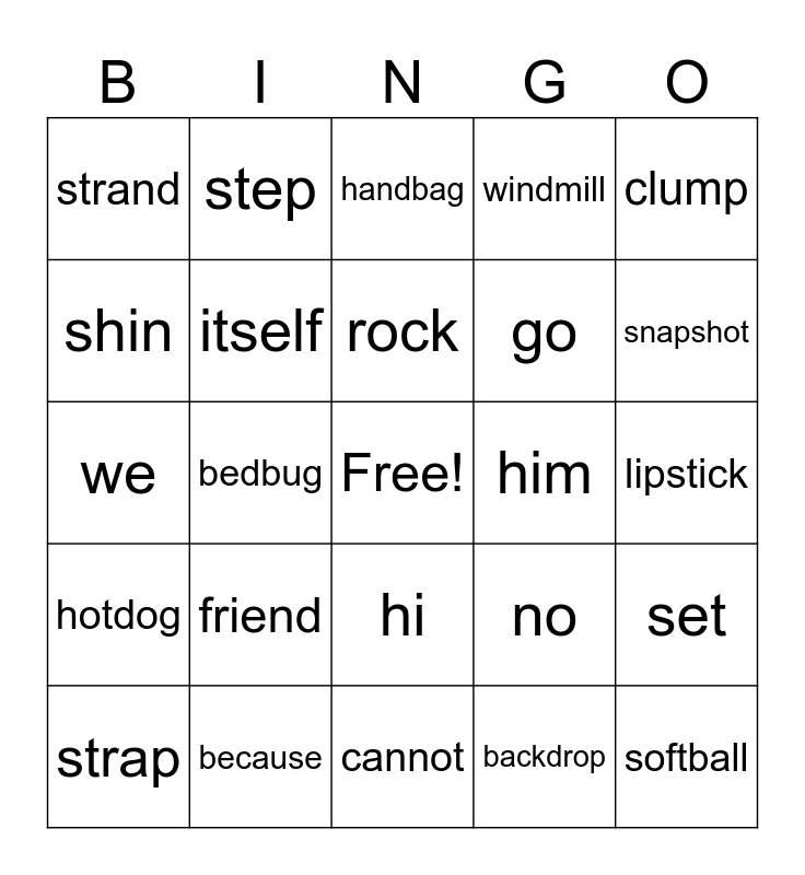 This bingo card has a free space and 24 words: friend, because, rock, strap, clump, strand, shin, step, him, hi, go, we, no, set, itself, backdrop, lipstick, handbag, snapshot, bedbug, softball, hotdog, windmill and cannot.