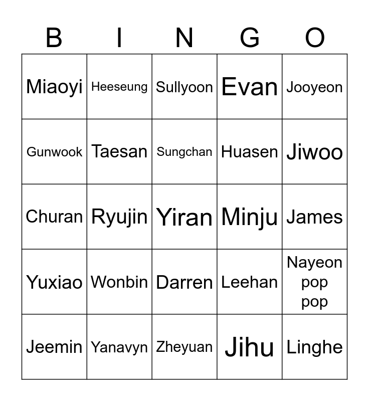 This bingo card has a free space and 24 words: Wonbin, Yanavyn, Sungchan, Jeemin, Jooyeon, Miaoyi, Gunwook, Heeseung, Minju, Darren, Huasen, Churan, Leehan, Nayeon pop pop, Taesan, Jihu, James, Sullyoon, Jiwoo, Ryujin, Linghe, Yuxiao, Evan and Zheyuan.