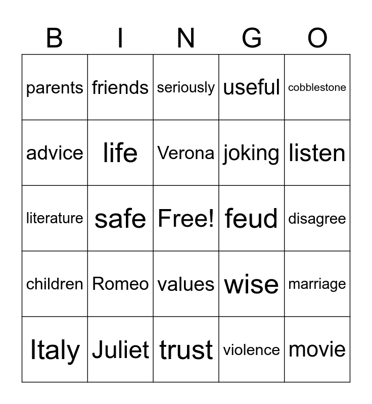 This bingo card has a free space and 24 words: Romeo, Juliet, Verona, Italy, cobblestone, parents, advice, friends, feud, values, joking, literature, wise, marriage, life, violence, disagree, seriously, listen, safe, movie, children, useful and trust.