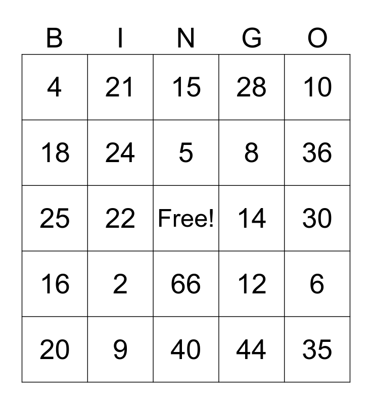 This bingo card has a free space and 27 words: 12, 55, 8, 40, 18, 15, 21, 16, 14, 6, 25, 28, 20, 9, 36, 1, 24, 5, 2, 4, 30, 44, 22, 35, 66, 10 and 60.