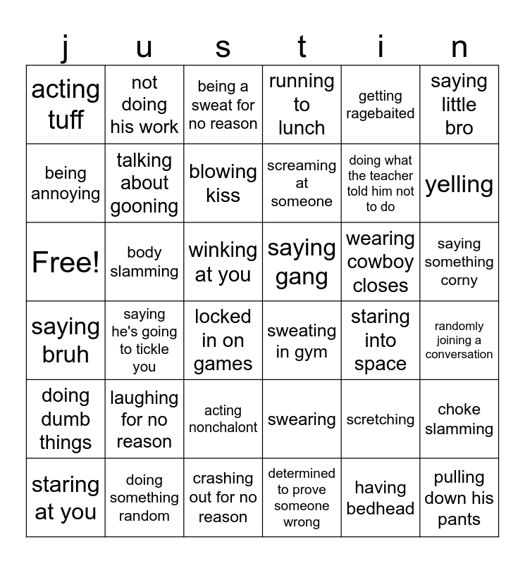 This bingo card has 36 words: swearing, acting nonchalont, determined to prove someone wrong, being annoying, saying bruh, saying gang, talking about gooning, crashing out for no reason, getting ragebaited, scretching, yelling, running to lunch, choke slamming, body slamming, screaming at someone, acting tuff, doing dumb things, wearing cowboy closes, Free!, being a sweat for no reason, winking at you, saying he's going to tickle you, sweating in gym, locked in on games, staring into space, not doing his work, doing what the teacher told him not to do, doing something random, blowing kiss, saying little bro, pulling down his pants, staring at you, randomly joining a conversation, saying something corny, laughing for no reason and having bedhead.