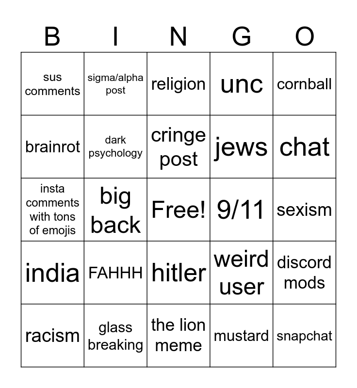 This bingo card has a free space and 24 words: FAHHH, glass breaking, cringe post, racism, cornball, sus comments, brainrot, sigma/alpha post, 9/11, hitler, jews, insta comments with tons of emojis, weird user, discord mods, dark psychology, mustard, sexism, religion, chat, big back, snapchat, india, unc and the lion meme.