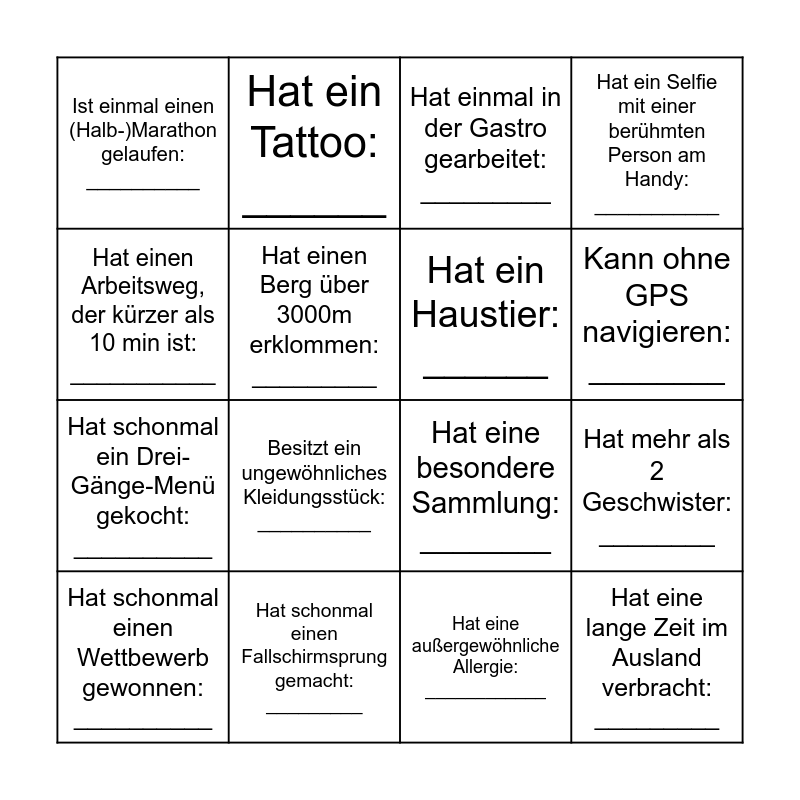 This bingo card has 21 words: Hat schonmal einen Fallschirmsprung gemacht: _________, Spricht mehr als 3 Sprachen: ________, Hat ein Tattoo: ______, Spielt regelmäßig ein Instrument: __________, Hat eine außergewöhnliche Allergie: ____________, Hat ein Haustier: ______, Ist einmal einen (Halb-)Marathon gelaufen: __________, Hat einmal in der Gastro gearbeitet: _________, Hat eine besondere Sammlung: ________, Kann ohne GPS navigieren: ________, Hat schonmal ein Drei-Gänge-Menü gekocht: __________, Hat ein Selfie mit einer berühmten Person am Handy: ___________, Hat eine lange Zeit im Ausland verbracht: _________, War schon einmal im Fernsehen: ________, Hat einen Berg über 3000m erklommen: _________, Ist schonmal einem Wildtier sehr nahe gekommen: __________, Hat schonmal einen Wettbewerb gewonnen: __________, Besitzt ein ungewöhnliches Kleidungsstück: __________, Hat einen Arbeitsweg, der kürzer als 10 min ist: ___________, Hat mehr als 2 Geschwister: ________ and Hat einen Motorradführerschein: __________.