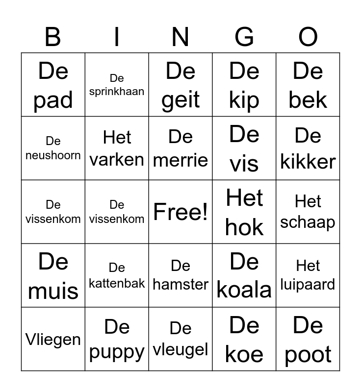 This bingo card has a free space and 106 words: De aap, De beer, De bek, De bever, De big, De bij, De boerderij, De boerin, De bok, De cavia, De dolfijn, De drinkbak, De eekhoorn, De eend, De egel, De flamingo, De geit, De giraf, De haan, De haas, De hamster, De hengst, De hond, De insecten, De kat / De poes, De kattenbak, De kikker, De kip, De kitten, De klauw, De koala, De koe, De krokodil, De kruiwagen, De leeuw, De leeuwin, De mand, De mees, De merrie, De mier, De moestuin, De mol, De mug, De muis, De mus, De neushoorn, De olifant, De pad, De papegaai, De poot, De pop / De cocon, De puppy, De ram, De regenworm, De rups, De slak, De slang, De specht, De spin, De sprinkhaan, De staart, De stal, De stier, De tijger, De tractor, De uil, De vijver, De vinnen, De vis, De vissenkom, De vissenkom, De vleugel, De vlinder, De voerbak, De vogel, De vogelkooi, De vogels, De vos, De welp, De zebra, De zeehond, De zoogdieren, De zwaan, Het aquarium, Het ei, Het hert, Het hok, Het hol, Het kalf, Het kippenhok, Het konijn, Het konijnenhok, Het kuiken, het lam, Het lieveheersbeestje, Het luipaard, Het nest, Het nijlpaard, Het paard, Het schaap, Het varken, Het veulen, Het weiland, Kruipen, Vliegen and Zwemmen.