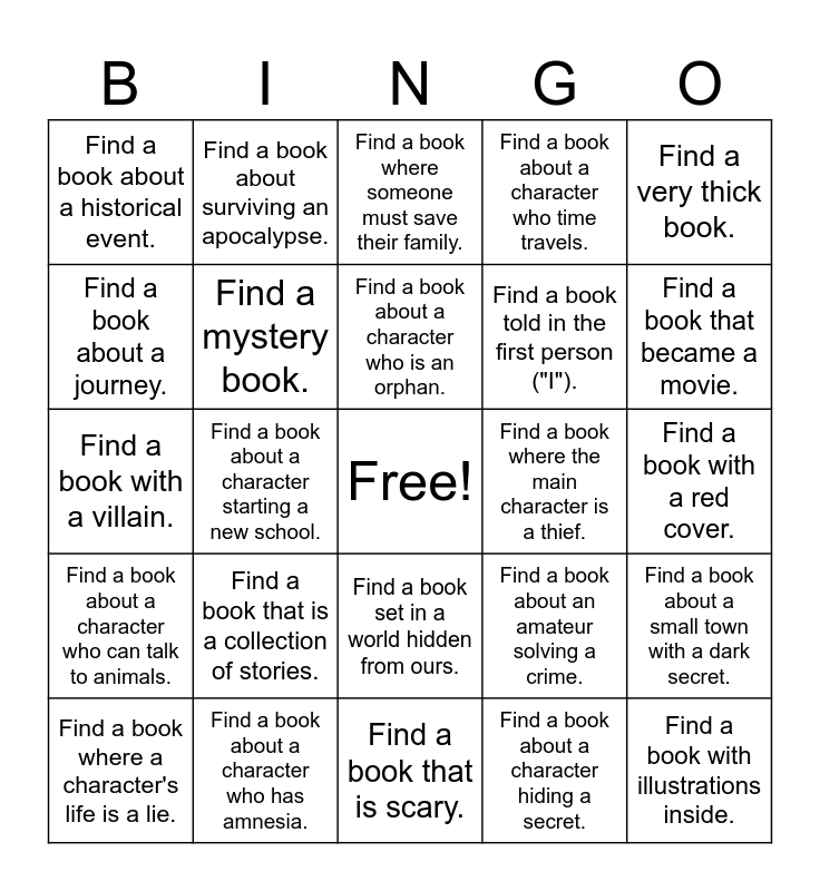 This bingo card has a free space and 120 words: Find a book about a character hiding a secret., Find a book about a character starting a new school., Find a book about a character who is an orphan., Find a book about an unsolved mystery from the past., Find a book where a character gets superpowers., Find a book about a dangerous competition., Find a book about a character who time travels., Find a book about a quest for a magical object., Find a book about a small town with a dark secret., Find a book about a character trying to survive., Find a book set in a dystopian society., Find a book about a character fulfilling a prophecy., Find a book about a forbidden friendship., Find a book where a character is wrongly accused., Find a book about a character seeking revenge., Find a book about a family curse., Find a book set in a world hidden from ours., Find a book where the main character is a thief., Find a book about an unlikely group of heroes., Find a book about a character forced to spy., Find a book where a character's life is a lie., Find a book where someone must save their family., Find a book about an amateur solving a crime., Find a book that starts with a mysterious letter., Find a book about a journey to a new land., Find a book about a character who can talk to animals., Find a book about a character who has amnesia., Find a book about a heist or an elaborate plan., Find a book about a character training for a battle., Find a book about surviving an apocalypse., Find a book about a character hiding a secret., Find a book about a character starting a new school., Find a book about a character who is an orphan., Find a book about an unsolved mystery from the past., Find a book where a character gets superpowers., Find a book about a dangerous competition., Find a book about a character who time travels., Find a book about a quest for a magical object., Find a book about a small town with a dark secret., Find a book about a character trying to survive., Find a book set in a dystopian society., Find a book about a character fulfilling a prophecy., Find a book about a forbidden friendship., Find a book where a character is wrongly accused., Find a book about a character seeking revenge., Find a book about a family curse., Find a book set in a world hidden from ours., Find a book where the main character is a thief., Find a book about an unlikely group of heroes., Find a book about a character forced to spy., Find a book where a character's life is a lie., Find a book where someone must save their family., Find a book about an amateur solving a crime., Find a book that starts with a mysterious letter., Find a book about a journey to a new land., Find a book about a character who can talk to animals., Find a book about a character who has amnesia., Find a book about a heist or an elaborate plan., Find a book about a character training for a battle., Find a book about surviving an apocalypse., Find a book set in the future., Find a book set in the past., Find a book that involves magic., Find a book set in a castle or palace., Find a book that takes place in space., Find a book about a journey., Find a book about a mystery., Find a book with an animal main character., Find a book about a king or queen., Find a book about a detective or spy., Find a book with a villain., Find a book about a group of friends., Find a book about a competition or game., Find a book about survival., Find a book set in a school., Find a book with a non-human character., Find a book told in the first person ("I")., Find a book that is part of a series., Find a book with illustrations inside., Find a book that is a collection of stories., Find a book about a historical event., Find a book that teaches you how to do something., Find a book about a family., Find a book set on an island., Find a book set in a city., Find a book that is funny., Find a book that is scary., Find a book told in letters or diary entries., Find a book about robots or artificial intelligence., Find a book with a one-word title., Find a book with a blue cover., Find a book with a red cover., Find a book with an animal on the cover., Find a book with a person on the cover., Find a book with no people on the cover., Find a hardcover book., Find a paperback book., Find a very thick book., Find a very thin book., Find a book of poetry., Find a graphic novel., Find a non-fiction book., Find a biography., Find a book about history., Find a book about science., Find a mystery book., Find a fantasy book., Find a science fiction book., Find a cookbook., Find a book about art or music., Find a book with a one-word title., Find a book with a number in the title., Find a book with a question in the title., Find an author whose last name starts with "T"., Find a book that became a movie., Find a book set in another country., Find a book with a map inside., Find a book from the 800s section., Find a book from the 900s section. and Find a book published in the last year..