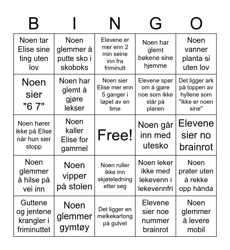 This bingo card has a free space and 24 words: Noen vipper på stolen, Noen glemmer gymtøy, Noen sier Elise mer enn 5 ganger i løpet av en time, Guttene og jentene krangler i friminuttet, Noen vanner planta si uten lov, Noen tar Elise sine ting uten lov, Noen sier "6 7", Noen glemmer å putte sko i skoboks, Noen går inn med utesko, Noen ruller ikke inn skjøteledning etter seg, Elevene spør om å gjøre noe som ikke står på planen, Noen hører ikke på Elise når hun sier stopp, Noen leker ikke med lekevenn i lekevennfri, Noen prater uten å rekke opp hånda, Noen har glemt å gjøre lekser, Elevene sier noe nummer brainrot, Elevene sier no brainrot, Elevene er mer enn 2 min seine inn fra friminutt, Det ligger ark på toppen av hyllene som "ikke er noen sine", Noen kaller Elise for gammel, Noen glemmer å levere mobil, Noen glemmer å hilse på vei inn, Noen har glemt bøkene sine hjemme and Det ligger en melkekartong på gulvet.
