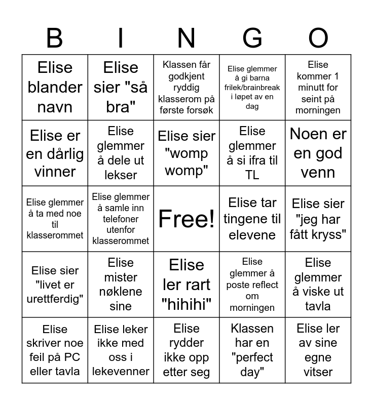 This bingo card has a free space and 24 words: Elise mister nøklene sine, Elise leker ikke med oss i lekevenner, Elise sier "womp womp", Elise skriver noe feil på PC eller tavla, Elise kommer 1 minutt for seint på morningen, Elise blander navn, Elise er en dårlig vinner, Elise sier "så bra", Elise tar tingene til elevene, Elise ler rart "hihihi", Elise glemmer å si ifra til TL, Elise glemmer å ta med noe til klasserommet, Elise glemmer å poste reflect om morningen, Elise glemmer å viske ut tavla, Elise glemmer å dele ut lekser, Klassen har en "perfect day", Elise sier "jeg har fått kryss", Klassen får godkjent ryddig klasserom på første forsøk, Noen er en god venn, Elise glemmer å samle inn telefoner utenfor klasserommet, Elise ler av sine egne vitser, Elise sier "livet er urettferdig", Elise glemmer å gi barna frilek/brainbreak i løpet av en dag and Elise rydder ikke opp etter seg.