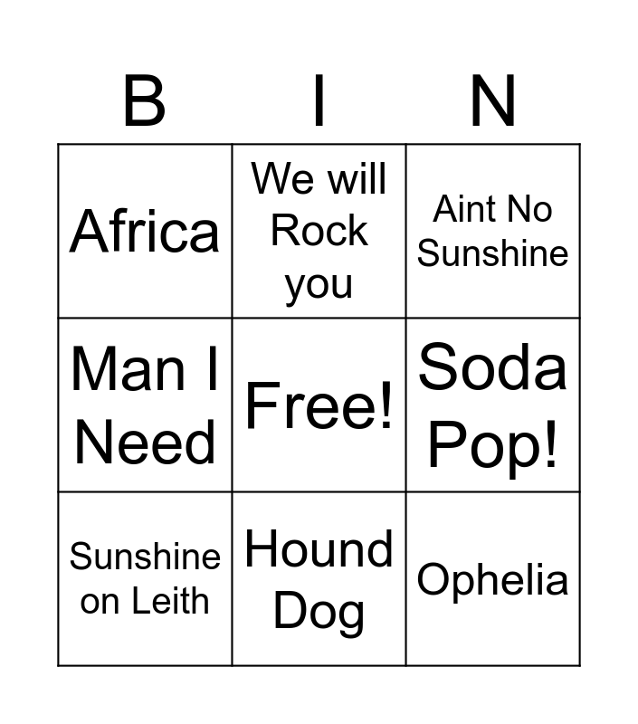 This bingo card has a free space and 11 words: You'l never walk Alone, Hound Dog, Ophelia, Sunshine on Leith, We will Rock you, Aint No Sunshine, Soda Pop!, Move your Feet, Man I Need, Africa and Shape of you.