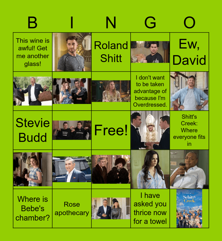 This bingo card has 27 images, a free space and 19 words: Fold in the Cheese, Ew, David, I have asked you thrice now for a towel, This wine is awful! Get me another glass!, I don't want to be taken advantage of because I'm Overdressed., Where is Bebe's chamber?, A little bit Alexis, The Rosebud Motel, Rose apothecary, Shitt's Creek: Where everyone fits in, Moira Rose, Johnny Rose, David Rose, Alexis Rose, Roland Shitt, Stevie Budd, Jocelyn Shitt, Ted Mullins and Patrick Brewer.