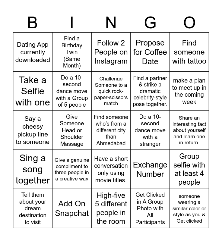 This bingo card has 25 words: Give a genuine compliment to three people in a creative way, High-five 5 different people in the room, Challenge Someone to a quick rock-paper-scissors match, Tell them about your dream destination to visit, Find someone with tattoo, Dating App currently downloaded, Take a Selfie with one, Find a Birthday Twin (Same Month), Do a 10-second dance move with a stranger, Have a short conversation only using movie titles., Find a partner & strike a dramatic celebrity-style pose together., Say a cheesy pickup line to someone, Exchange Number, Group selfie with at least 4 people, Do a 10-second dance move with a Group of 5 people, someone wearing a similar color or style as you & Get clicked, Share an interesting fact about yourself and learn one in return., Follow 2 People on Instagram, make a plan to meet up in the coming week, Give Someone Head or Shoulder Massage, Find someone who’s from a different city than Ahmedabad, Add On Snapchat, Sing a song together, Propose for Coffee Date and Get Clicked in A Group Photo with All Participants.