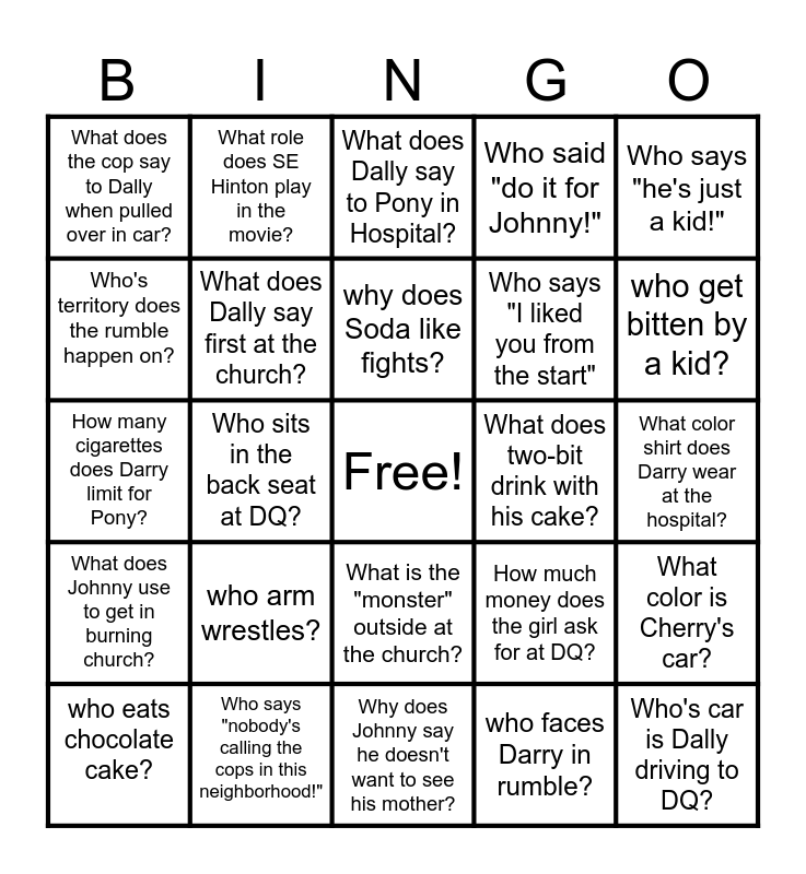This bingo card has a free space and 25 words: who eats chocolate cake?, who arm wrestles?, why does Soda like fights?, who faces Darry in rumble?, who get bitten by a kid?, What does the cop say to Dally when pulled over in car?, What role does SE Hinton play in the movie?, What does Dally say to Pony in Hospital?, Who says "I liked you from the start", What color is Cherry's car?, How many cigarettes does Darry limit for Pony?, What does Dally say first at the church?, How much money does the girl ask for at DQ?, Who's car is Dally driving to DQ?, Who's territory does the rumble happen on?, Who says "nobody's calling the cops in this neighborhood!", Why does Johnny say he doesn't want to see his mother?, Who said "do it for Johnny!", What color shirt does Darry wear at the hospital?, What does Johnny use to get in burning church?, Who sits in the back seat at DQ?, What is the "monster" outside at the church?, What does two-bit drink with his cake?, Who says "he's just a kid!" and What does Johnny say when reading "Gone with the Wind?".