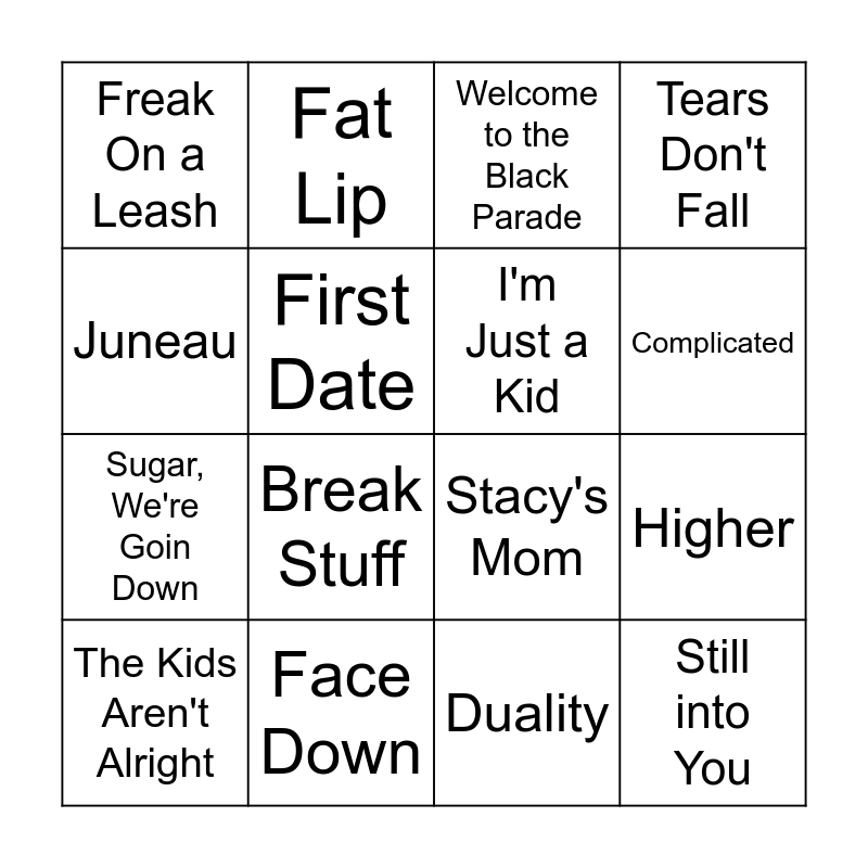 This bingo card has 27 words: Cute Without The E, Dirty Little Secret, Sugar, We're Goin Down, Good Riddance(Time of Your Life), First Date, Welcome to the Black Parade, Fat Lip, Still into You, Face Down, Teenage Dirtbag, Stacy's Mom, Tears Don't Fall, This Could Be Anywhere in the World, In the End, Break Stuff, Since U Been Gone, I'm Just a Kid, Complicated, Until the Day I Die, Freak On a Leash, Duality, Covet, Higher, The Kids Aren't Alright, Last Resort, Juneau and Tribute.