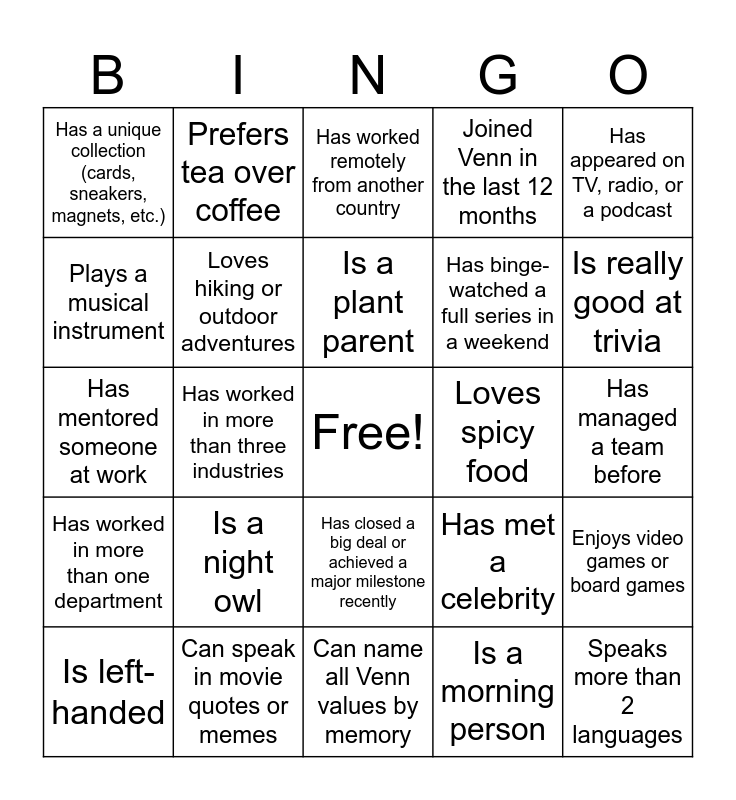 This bingo card has a free space and 53 words: Has lived in another country, Speaks more than 2 languages, Has a pet, Is a morning person, Is a night owl, Loves coffee more than tea, Prefers tea over coffee, Has a hidden talent, Plays a musical instrument, Enjoys cooking or baking, Loves hiking or outdoor adventures, Practices yoga or meditation, Enjoys video games or board games, Has met a celebrity, Has kids, Is left-handed, Is a plant parent, Loves spicy food, Is a big podcast listener, Has appeared on TV, radio, or a podcast, Has worked in more than three industries, Loves reading, Has binge-watched a full series in a weekend, Has a unique collection (cards, sneakers, magnets, etc.), Has tried an extreme sport, Can speak in movie quotes or memes, Has attended a concert in the last year, Loves DIY or home improvement projects, Is a vegetarian, Is really good at trivia, Is obsessed with organization, Uses dark mode for everything, Two or more people share this name at Venn, Loves karaoke, Has run a race or completed a sports challenge, Has been at Venn for over 3 years, Joined Venn in the last 12 months, Can name all Venn values by memory, Has worked remotely from another country, Harry Potter fan, The Summer I Turned Pretty fan, Has worked fully remote for more than 3 years, Has managed a team before, Has experience in both startups and large companies, Has switched careers at least once, Has closed a big deal or achieved a major milestone recently, Has built or launched a product, Has attended a tech conference in the last year, Has mentored someone at work, Has worked in more than one department, Has traveled for work in the past year, Has conducted interviews before and Has worked in the office this week.