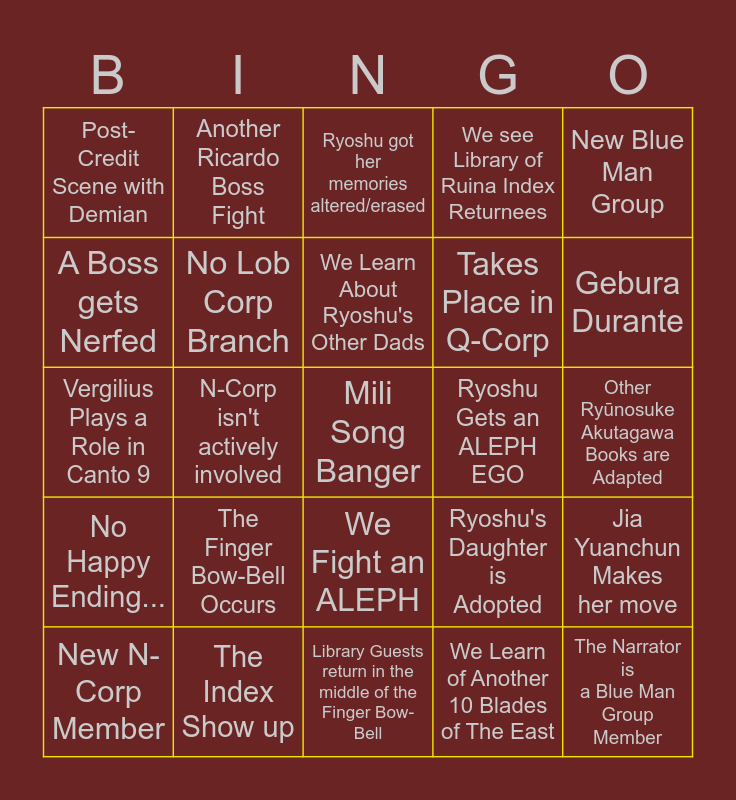 This bingo card has a free space and 24 words: The Finger Bow-Bell Occurs, The Index Show up, We Learn About Ryoshu's Other Dads, New N-Corp Member, New Blue Man Group, Post-Credit Scene with Demian, A Boss gets Nerfed, Another Ricardo Boss Fight, Ryoshu Gets an ALEPH EGO, We Fight an ALEPH, Takes Place in Q-Corp, Vergilius Plays a Role in Canto 9, Ryoshu's Daughter is Adopted, Jia Yuanchun Makes her move, No Lob Corp Branch, We Learn of Another 10 Blades of The East, Other Ryūnosuke Akutagawa Books are Adapted, Ryoshu got her memories altered/erased, Gebura Durante, N-Corp isn't actively involved, The Narrator is a Blue Man Group Member, No Happy Ending..., We see Library of Ruina Index Returnees and Library Guests return in the middle of the Finger Bow-Bell.