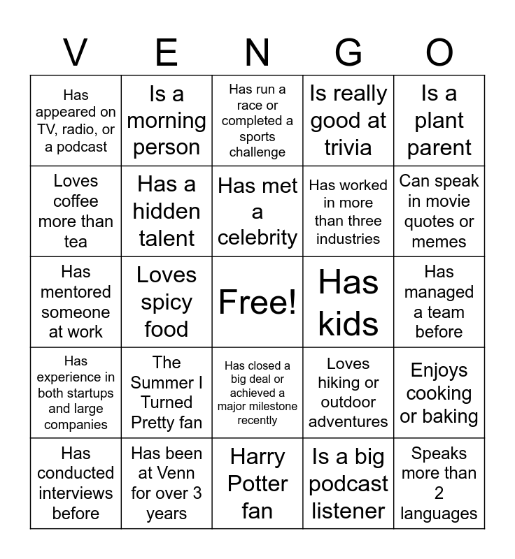 This bingo card has a free space and 52 words: Has lived in another country, Speaks more than 2 languages, Is a vegetarian, Harry Potter fan, The Summer I Turned Pretty fan, Has a pet, Is a morning person, Is a night owl, Loves coffee more than tea, Prefers tea over coffee, Has a hidden talent, Plays a musical instrument, Enjoys cooking or baking, Loves hiking or outdoor adventures, Practices yoga or meditation, Enjoys video games or board games, Has met a celebrity, Has kids, Is left-handed, Is a plant parent, Loves spicy food, Is a big podcast listener, Has appeared on TV, radio, or a podcast, Has worked in more than three industries, Loves reading, Has binge-watched a full series in a weekend, Has a unique collection (cards, sneakers, magnets, etc.), Has tried an extreme sport, Can speak in movie quotes or memes, Has attended a concert in the last year, Loves DIY or home improvement projects, Is really good at trivia, Is obsessed with organization, Uses dark mode for everything, Loves karaoke, Has run a race or completed a sports challenge, Has been at Venn for over 3 years, Joined Venn in the last 12 months, Can name all Venn values by memory, Has worked remotely from another country, Has worked fully remote for more than 3 years, Has managed a team before, Has experience in both startups and large companies, Has switched careers at least once, Has closed a big deal or achieved a major milestone recently, Has built or launched a product, Has attended a tech conference in the last year, Has mentored someone at work, Has worked in more than one department, Has traveled for work in the past year, Has conducted interviews before and Has worked in the office this week.