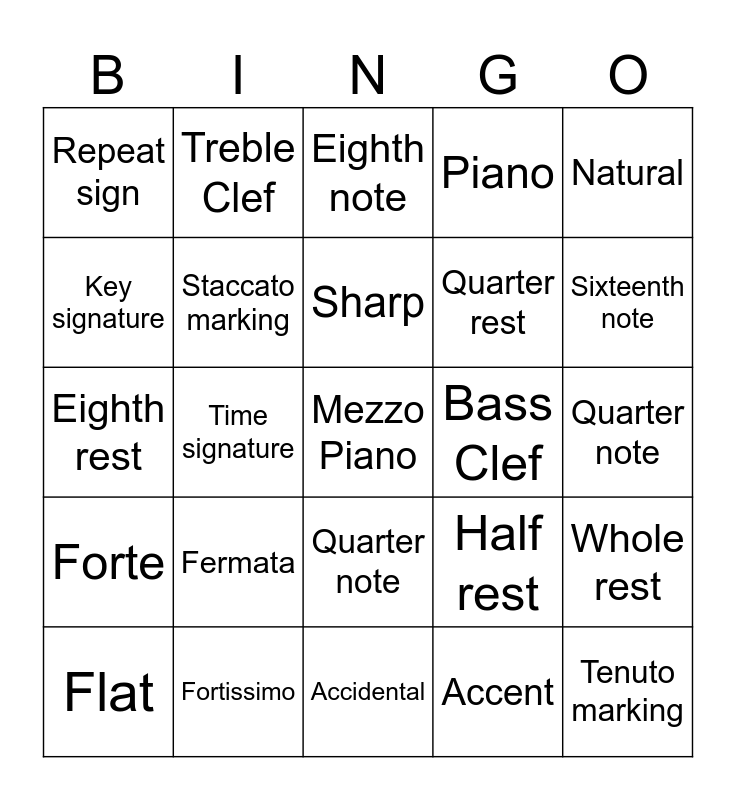 This bingo card has 25 words: Fermata, Accidental, Sharp, Flat, Natural, Repeat sign, Key signature, Treble Clef, Bass Clef, Quarter note, Quarter rest, Eighth rest, Half rest, Whole rest, Staccato marking, Tenuto marking, Quarter note, Eighth note, Sixteenth note, Time signature, Mezzo Piano, Fortissimo, Forte, Piano and Accent.