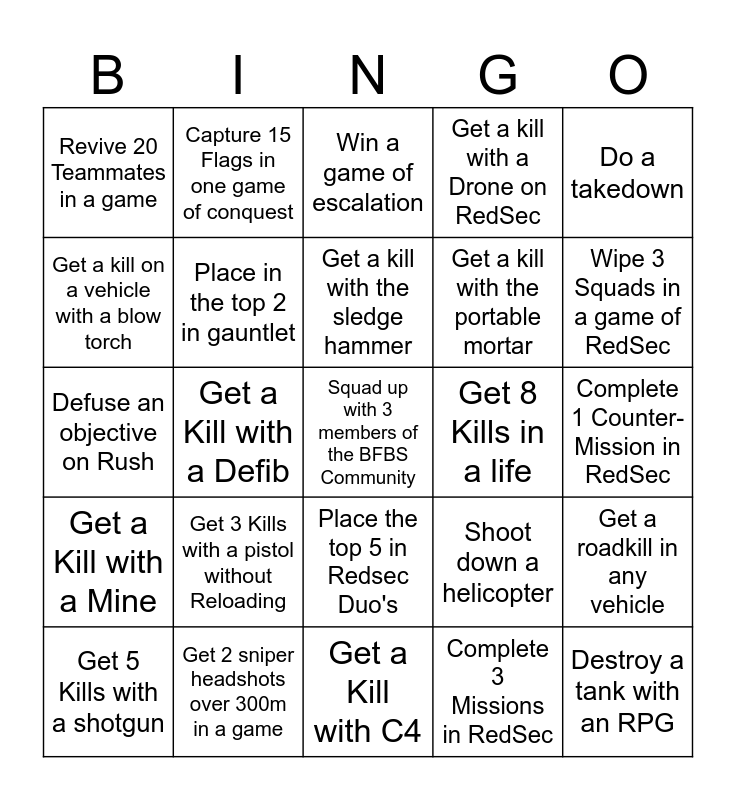 This bingo card has a free space and 24 words: Get 3 Kills with a pistol without Reloading, Get 2 sniper headshots over 300m in a game, Get a kill with the sledge hammer, Get 5 Kills with a shotgun, Do a takedown, Revive 20 Teammates in a game, Get a kill on a vehicle with a blow torch, Capture 15 Flags in one game of conquest, Get 8 Kills in a life, Place the top 5 in Redsec Duo's, Get a kill with the portable mortar, Defuse an objective on Rush, Shoot down a helicopter, Get a roadkill in any vehicle, Place in the top 2 in gauntlet, Complete 3 Missions in RedSec, Complete 1 Counter- Mission in RedSec, Win a game of escalation, Wipe 3 Squads in a game of RedSec, Get a Kill with a Defib, Destroy a tank with an RPG, Get a Kill with a Mine, Get a kill with a Drone on RedSec and Get a Kill with C4.