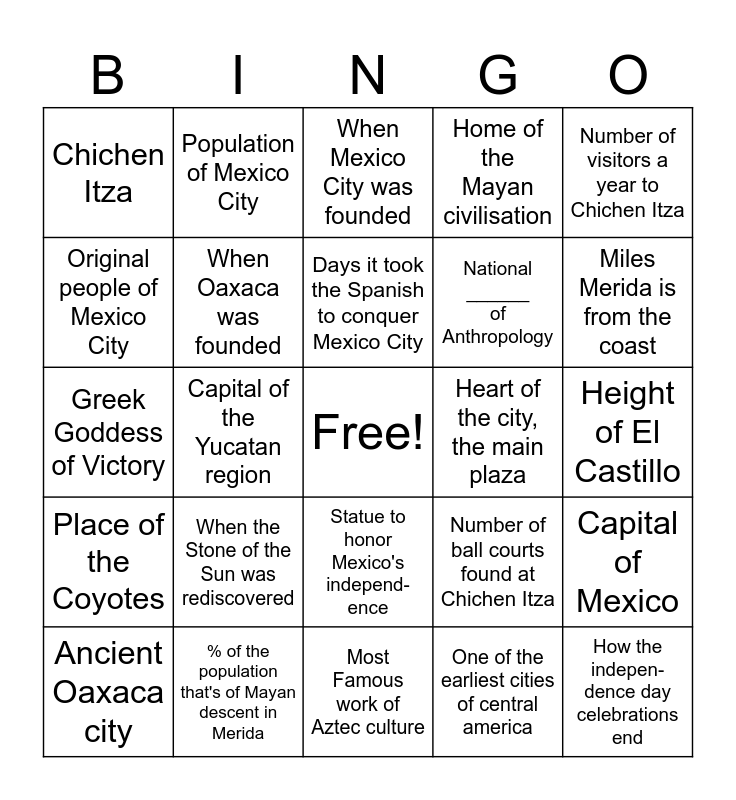 This bingo card has a free space and 28 words: Capital of Mexico, Mayan peoples, religion, culture, National ______ of Anthropology, One of the earliest cities of central america, Original people of Mexico City, When Mexico City was founded, Population of Mexico City, Place of the Coyotes, Heart of the city, the main plaza, Ancient Oaxaca city, Greek Goddess of Victory, Home of the Mayan civilisation, % of the population that's of Mayan descent in Merida, Most Famous work of Aztec culture, Miles Merida is from the coast, Mexican Indepen-dence day, When the Stone of the Sun was rediscovered, When Oaxaca was founded, Days it took the Spanish to conquer Mexico City, Statue to honor Mexico's independ-ence, Chichen Itza, When Chichen Itza was built, How the indepen-dence day celebrations end, Capital of the Yucatan region, Height of El Castillo, Number of ball courts found at Chichen Itza, Number of visitors a year to Chichen Itza and % of Chichen Itza that's been found so far.
