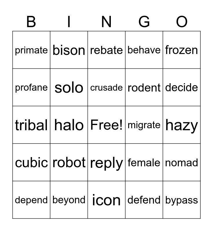 This bingo card has a free space and 24 words: robot, beyond, crusade, depend, frozen, primate, profane, bison, migrate, reply, rodent, tribal, female, nomad, solo, defend, hazy, rebate, decide, halo, bypass, cubic, behave and icon.