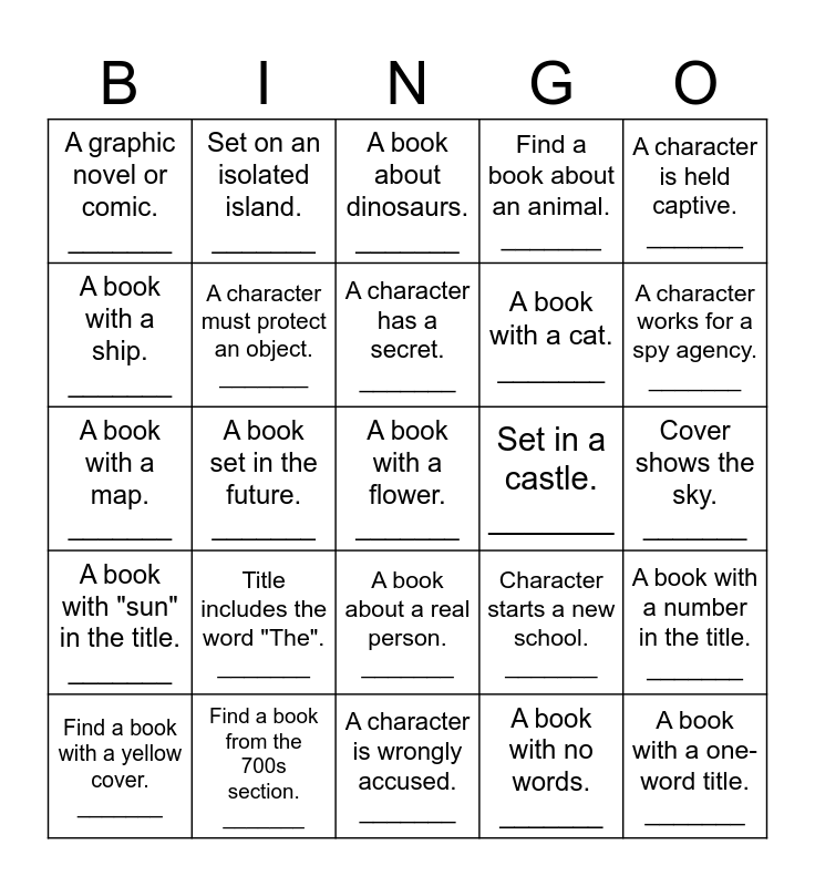 This bingo card has 121 words: Free!, Find a book with a blue cover. _______, Find a book with a red spine. _______, A book with a one-word title. _______, Find a book with a map. _______, A book that became a movie. _______, Find a book about an animal. _______, Find a book about space. _______, A book with a number in the title. _______, Find a book of poetry. _______, A book set in the future. _______, Find a book about a president. _______, Find a book with a ship on the cover. _______, A book that is a mystery. _______, Find a book about sports. _______, Find a book with recipes. _______, A book about a real person. _______, Find a book about magic. _______, Find a very thick book. _______, Find a very thin book. _______, Find a book with a yellow cover. _______, A book about dinosaurs. _______, Find a book about art. _______, A book that won an award. _______, Find a "New Arrival" book. _______, A book with "sun" in the title. _______, Find a book from the 700s section. _______, Find a book from the 900s section. _______, An author's last name starts with 'T'. _______, Find a book with a dragon. _______, A book with no words. _______, A book set in the future. _______, A character has a secret. _______, A book about a mystery. _______, Set in a magical world. _______, A character on a quest. _______, A character who time-travels. _______, A book about a competition. _______, Set during a historical event. _______, A character finds a map. _______, Set at a special school. _______, A character saves their family. _______, A book about surviving disaster. _______, Set on another planet. _______, A character with magical powers. _______, A book about a theft. _______, A book about unlikely friends. _______, Set in a castle. _______, A character running from danger. _______, A book about a journey. _______, Main character is an orphan. _______, Set in a small town. _______, Character starts a new school. _______, About a magical object. _______, A character who is royal. _______, Set in a big city. _______, A book about a spy. _______, A book about a war. _______, A character talks to animals. _______, Set on an isolated island. _______, A character breaks a rule. _______, A book with a blue cover. _______, A book with a red spine. _______, A book with an animal. _______, A book with a person. _______, A book with a ship. _______, A book with a castle. _______, A book with a one-word title. _______, A book with a number. _______, A book with an award sticker. _______, A book with a map. _______, Author's last name starts 'S'. _______, A book with a yellow cover. _______, A book with a black cover. _______, A book with a dragon. _______, A book with a cat. _______, A book with a key. _______, A book with a tree. _______, A book with the moon. _______, A book with a flower. _______, Title includes the word "The". _______, A graphic novel or comic. _______, A book with no words. _______, Cover has two people. _______, Cover shows a city. _______, Cover shows the ocean. _______, A mostly green cover. _______, A book with a car. _______, Cover shows the sky. _______, A book with a sword. _______, A book about sports. _______, A character loses their memory. _______, A character is wrongly accused. _______, Set in two different timelines. _______, A character fakes their identity. _______, A character receives a mysterious letter. _______, A family secret is revealed. _______, A character joins a rebellion. _______, A character is held captive. _______, A character communicates with ghosts. _______, Set inside a virtual world. _______, A character's friend betrays them. _______, A character must solve a riddle. _______, Set during a harsh blizzard. _______, A character must protect an object. _______, A character's new home is haunted. _______, A character must break a curse. _______, A character is shipwrecked. _______, A character wakes in another body. _______, A character must learn to survive. _______, A character is searching for someone. _______, Set in an abandoned city. _______, A character has a strange illness. _______, A character must win a race. _______, A book about an arranged marriage. _______, A character works for a spy agency. _______, A character's parents are missing. _______, A character's invention goes wrong. _______, A character is a reluctant hero. _______, A character's diary is found. _______ and A character must pass a test. _______.