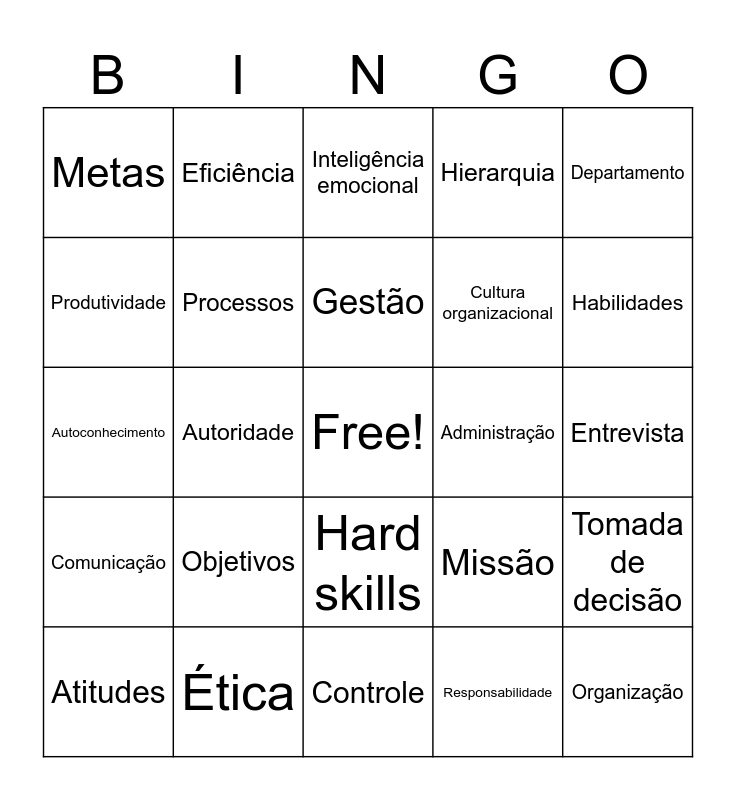 This bingo card has a free space and 48 words: Planejamento, Organização, Direção, Controle, Objetivos, Estratégia, Eficiência, Eficácia, Produtividade, Recursos, Processos, Hierarquia, Tomada de decisão, Missão, Visão, Valores, Gestão, Administração, Feedback, Departamento, Autoridade, Responsabilidade, Metas, Cultura organizacional, Competências, Habilidades, Atitudes, Soft skills, Hard skills, Comunicação, Proatividade, Criatividade, Trabalho em equipe, Empatia, Ética, Networking, Currículo, Entrevista, Resiliência, Liderança, Motivação, Perfil profissional, Inteligência emocional, Aprendizagem contínua, Autoconhecimento, Comprometimento, Pontualidade and Empreendedorismo.