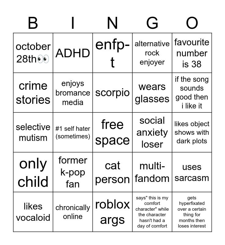 This bingo card has a free space and 24 words: former k-pop fan, chronically online, scorpio, likes vocaloid, favourite number is 38, october 28th๐, crime stories, ADHD, social anxiety loser, cat person, wears glasses, selective mutism, multi-fandom, uses sarcasm, enjoys bromance media, says" this is my comfort character" while the character hasn't had a day of comfort, likes object shows with dark plots, enfp-t, if the song sounds good then i like it, #1 self hater (sometimes), gets hyperfixated over a certain thing for months then loses interest, only child, alternative rock enjoyer and roblox args.