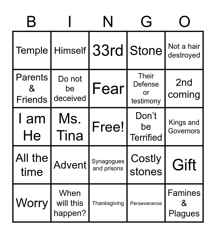 This bingo card has a free space and 28 words: Worry, Wisdom, Fear, Perseverance, Not a hair destroyed, Parents & Friends, Himself, Synagogues and prisons, Don’t be Terrified, Famines & Plagues, I am He, Do not be deceived, Not 1 stone left, Costly stones, 2nd coming, Luke, Advent, 33rd, Stone, Gift, Temple, When will this happen?, Thanksgiving, Their Defense or testimony, Kings and Governors, All the time, Ms. Tina and Seized & persecuted.