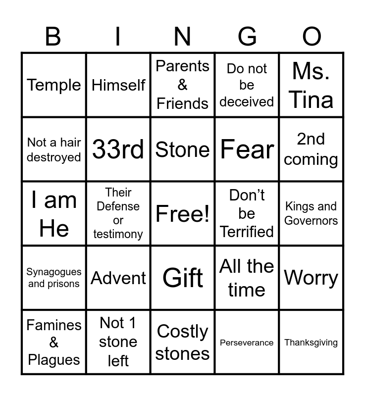 This bingo card has a free space and 28 words: Worry, Wisdom, Fear, Perseverance, Not a hair destroyed, Parents & Friends, Himself, Synagogues and prisons, Don’t be Terrified, Famines & Plagues, I am He, Do not be deceived, Not 1 stone left, Costly stones, 2nd coming, Luke, Advent, 33rd, Stone, Gift, Temple, When will this happen?, Thanksgiving, Their Defense or testimony, Kings and Governors, All the time, Ms. Tina and Seized & persecuted.