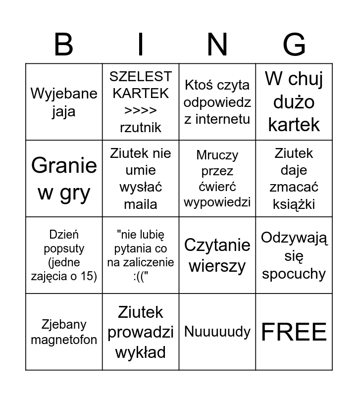 This bingo card has 16 words: Ziutek prowadzi wykład, Odzywają się spocuchy, Ktoś czyta odpowiedz z internetu, Wyjebane jaja, Dzień popsuty (jedne zajęcia o 15), SZELEST KARTEK >>>> rzutnik, Czytanie wierszy, Nuuuuudy, Granie w gry, Ziutek nie umie wysłać maila, Zjebany magnetofon, W chuj dużo kartek, "nie lubię pytania co na zaliczenie :((", Ziutek daje zmacać książki, Mruczy przez ćwierć wypowiedzi and FREE.
