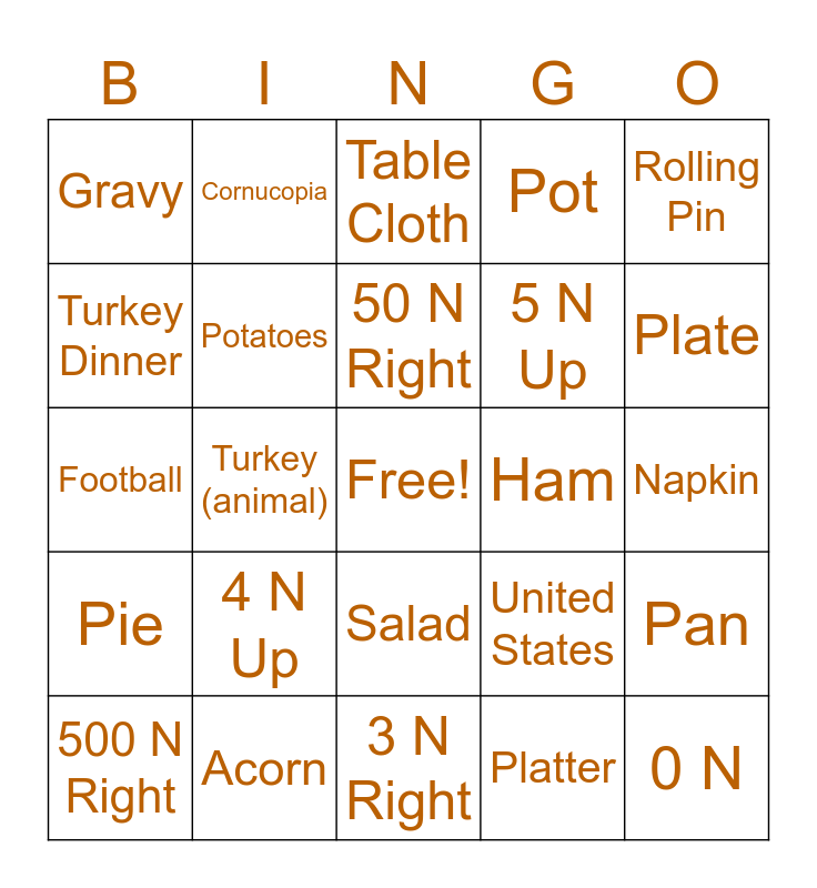 This bingo card has a free space and 42 words: Stuffing, 50 N Right, Feast, 4 N Up, Platter, Pan, 0 N, Family, Table Cloth, Salad, Napkin, Plate, Turkey (animal), Rolling Pin, Friends, United States, Oven, Football, 14 N Right, Cornucopia, Turkey Dinner, Rolls, 75 N Right, Gravy, 50 N Left, Corn, 5 N Up, Sweet Potatoes, 40 N Up, Squash, Pumpkin, Pie, Potatoes, 3 N Right, Apple, 500 N Right, Acorn, Ham, Oven Mitts, Parade, Pot and Cranberry.