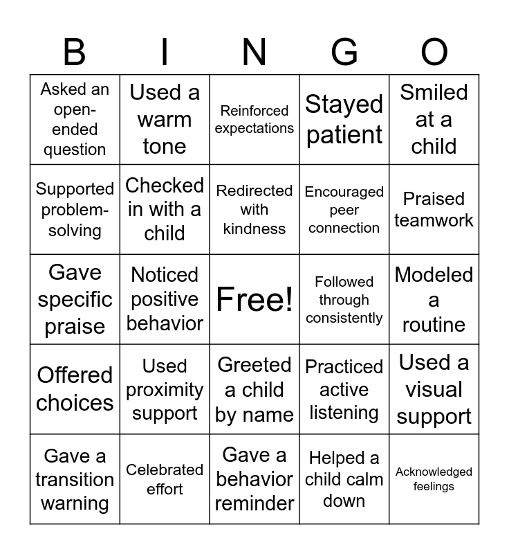 This bingo card has a free space and 24 words: Used proximity support, Celebrated effort, Redirected with kindness, Gave a transition warning, Smiled at a child, Asked an open-ended question, Supported problem-solving, Used a warm tone, Followed through consistently, Greeted a child by name, Encouraged peer connection, Gave specific praise, Practiced active listening, Used a visual support, Checked in with a child, Helped a child calm down, Modeled a routine, Reinforced expectations, Praised teamwork, Noticed positive behavior, Acknowledged feelings, Offered choices, Stayed patient and Gave a behavior reminder.
