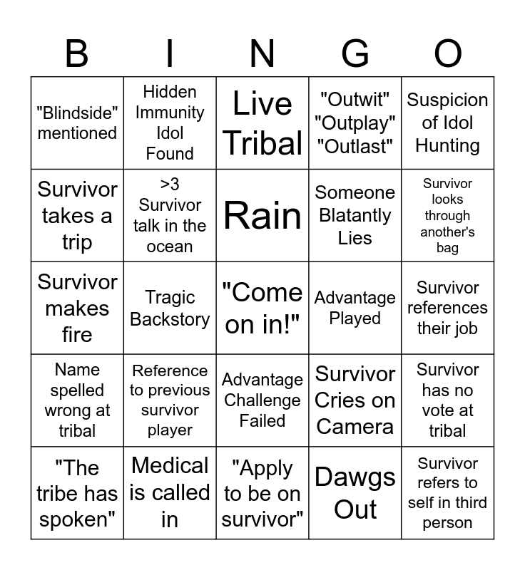 This bingo card has a free space and 24 words: Reference to previous survivor player, Medical is called in, Rain, "The tribe has spoken", Suspicion of Idol Hunting, "Blindside" mentioned, Survivor takes a trip, Hidden Immunity Idol Found, Advantage Played, Advantage Challenge Failed, Someone Blatantly Lies, Survivor makes fire, Survivor Cries on Camera, Survivor has no vote at tribal, >3 Survivor talk in the ocean, Dawgs Out, Survivor references their job, Live Tribal, Survivor looks through another's bag, Tragic Backstory, Survivor refers to self in third person, Name spelled wrong at tribal, "Outwit" "Outplay" "Outlast" and "Apply to be on survivor".